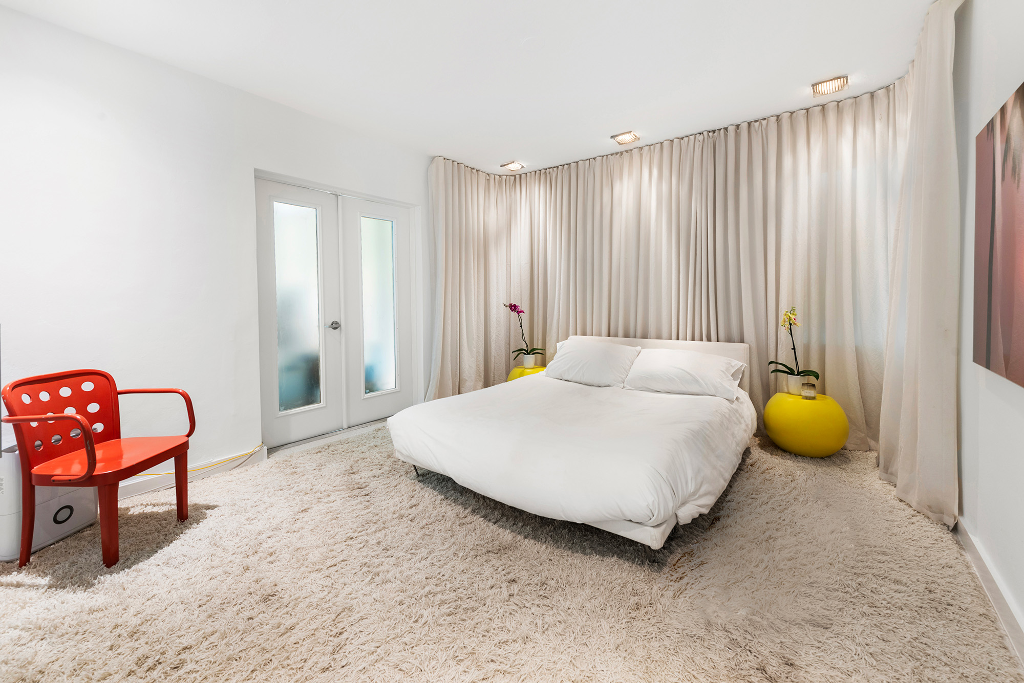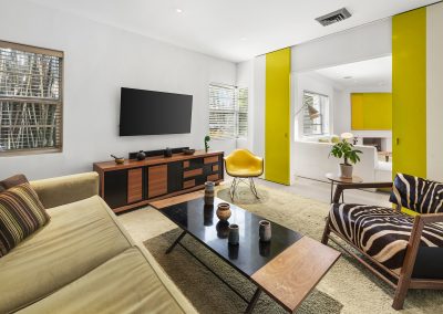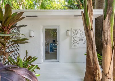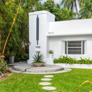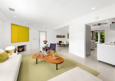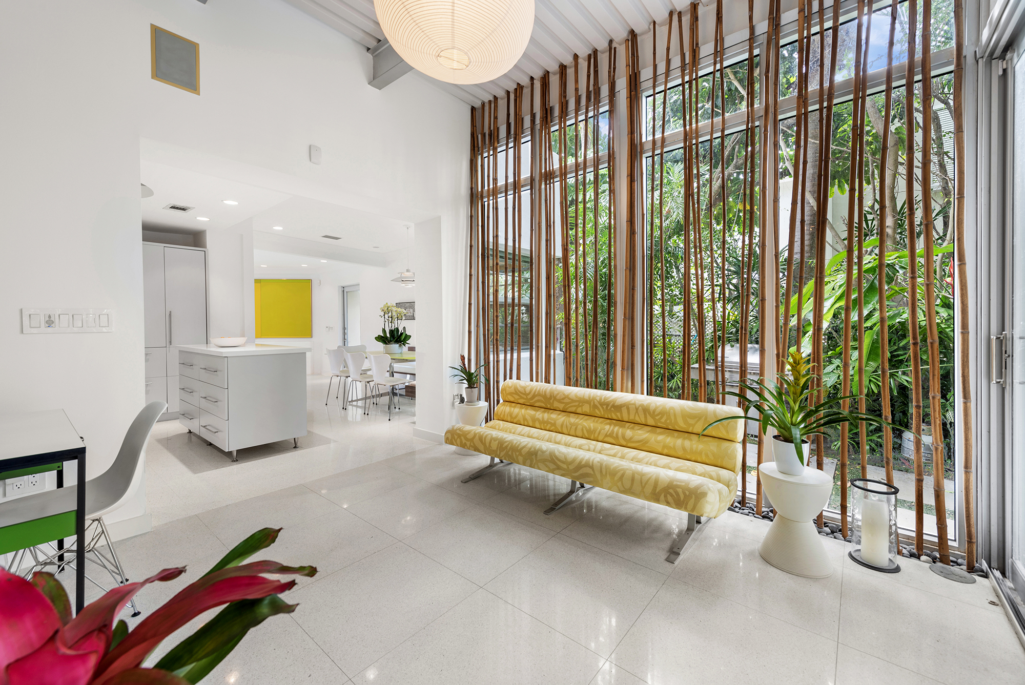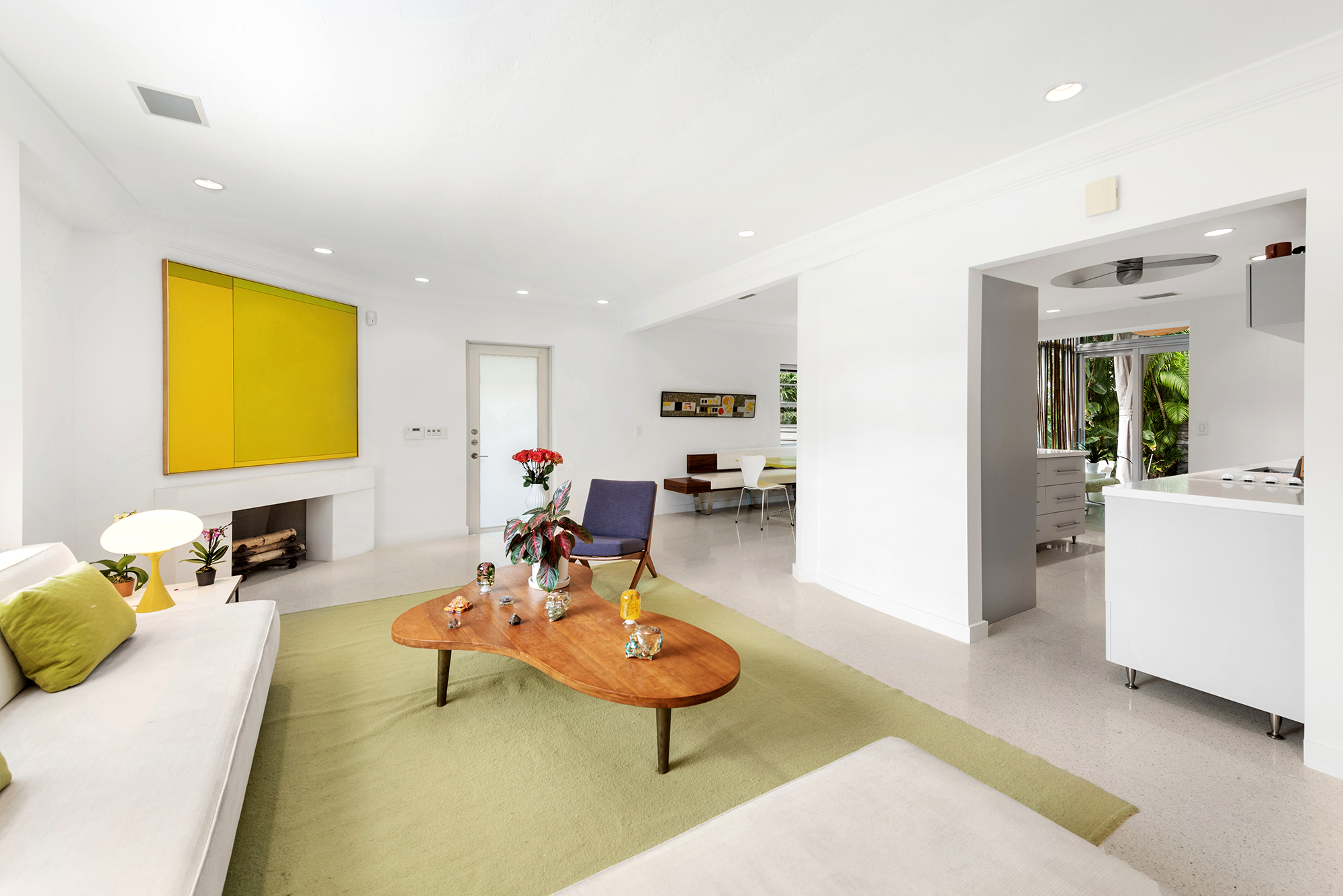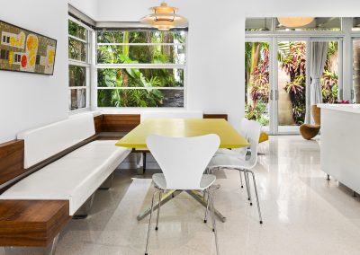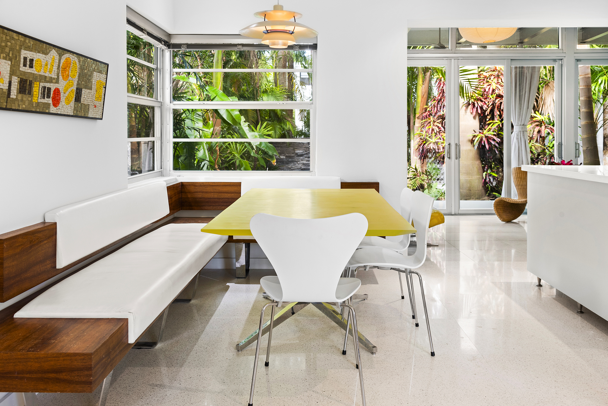 This sunny and sophisticated Art Deco bungalow plus guesthouse on San Marino Island offers a midmod environment that bursts with color. Enjoy the privacy of a lush backyard with pool and garden complemented by a mid-century interior design by renowned Robert Kaner. Representing Miami Beach’s ‘style moderne’ at its finest, this is an opportunity to own a piece of history on the Venetian Islands. Ornamental details and vibrant, citrusy colors throughout create a low-key ode to 1930s tropical modernism with a touch of minimalist exuberance. A bright living space with white terrazzo flooring welcomes you into an open layout. The den, adorned with custom, vintage pieces, offers a tranquil escape with its warm, subdued colors, a contrast to the vibrant allure throughout the rest of the home.