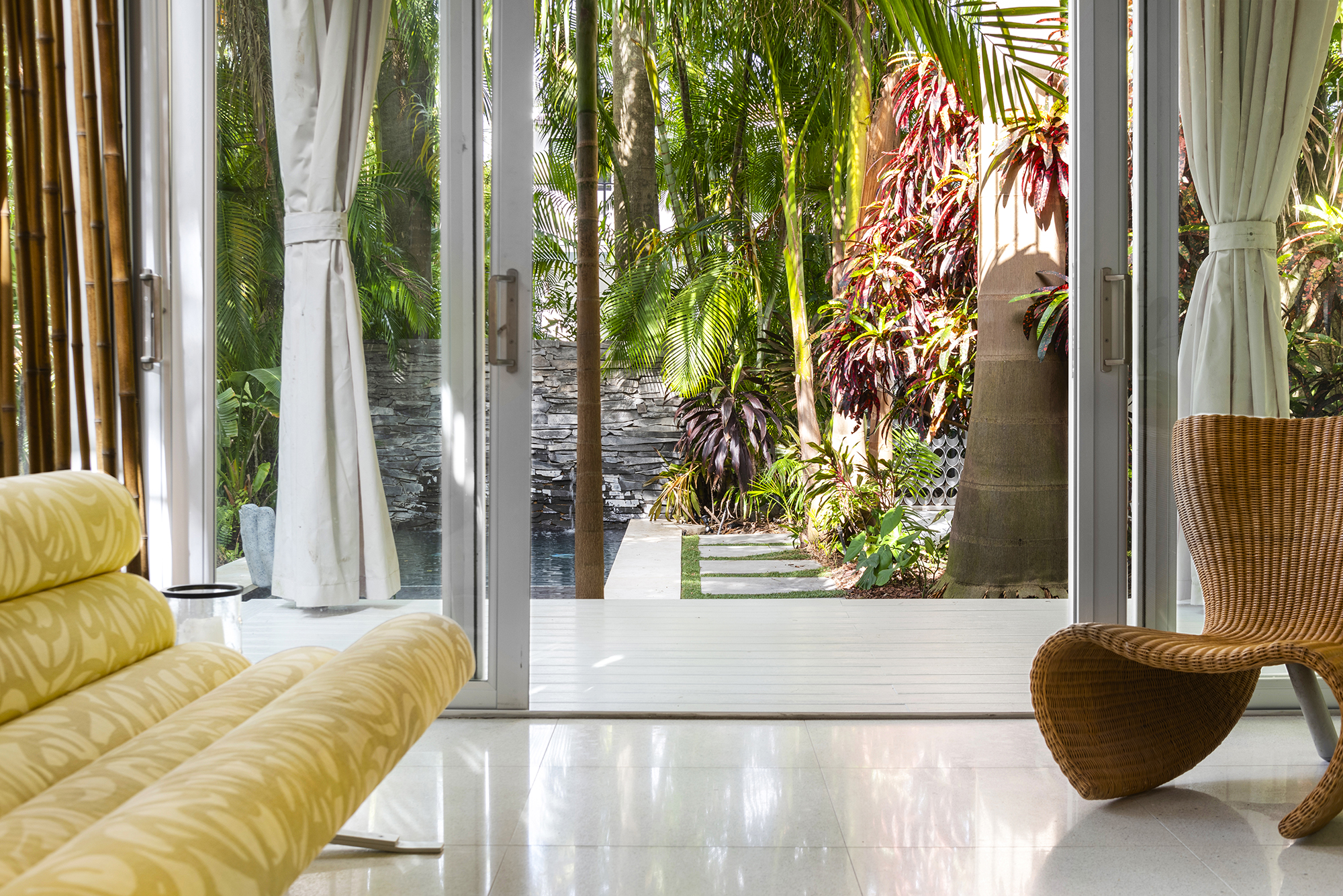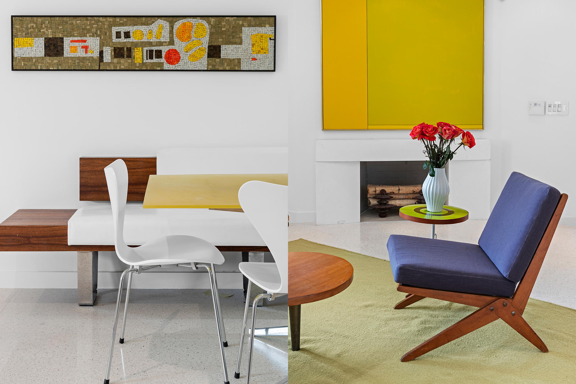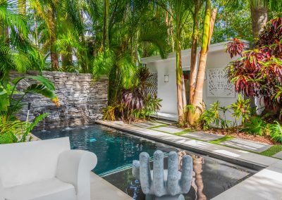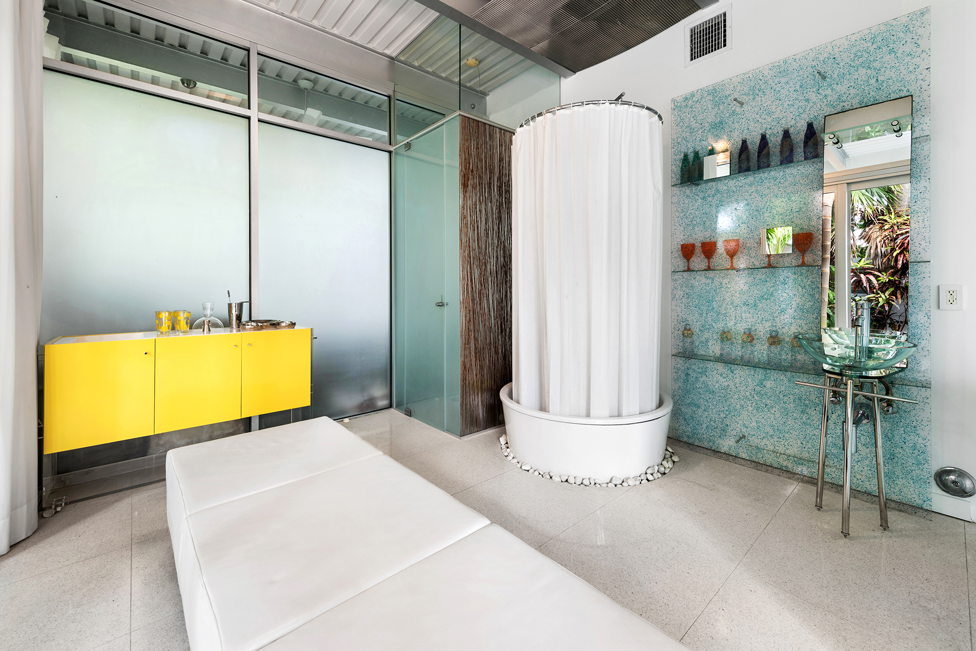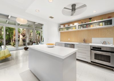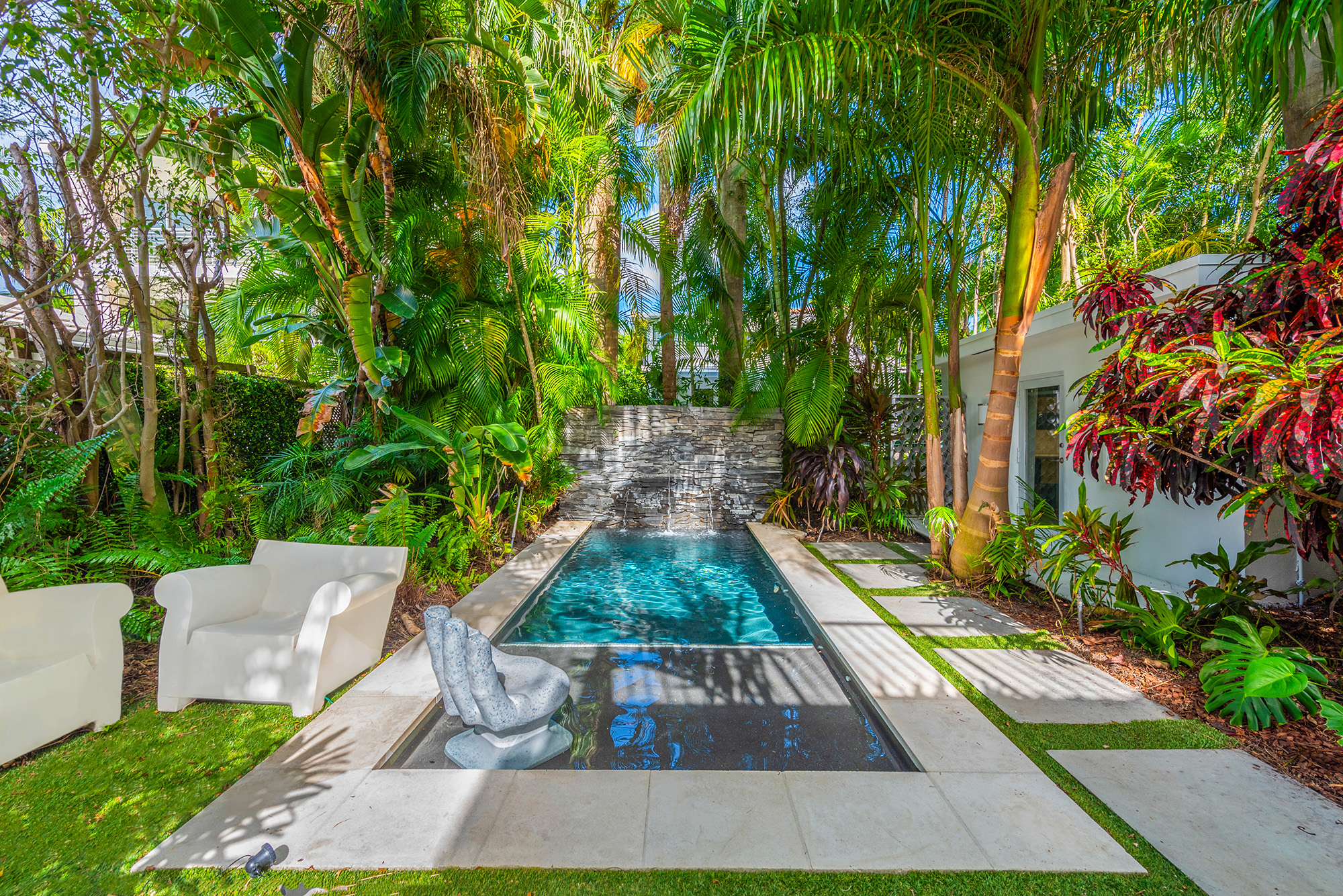 This sunny and sophisticated Art Deco bungalow plus guesthouse on San Marino Island offers a midmod environment that bursts with color. Enjoy the privacy of a lush backyard with pool and garden complemented by a mid-century interior design by renowned Robert Kaner. Representing Miami Beach’s ‘style moderne’ at its finest, this is an opportunity to own a piece of history on the Venetian Islands. Ornamental details and vibrant, citrusy colors throughout create a low-key ode to 1930s tropical modernism with a touch of minimalist exuberance. A bright living space with white terrazzo flooring welcomes you into an open layout. The den, adorned with custom, vintage pieces, offers a tranquil escape with its warm, subdued colors, a contrast to the vibrant allure throughout the rest of the home.
